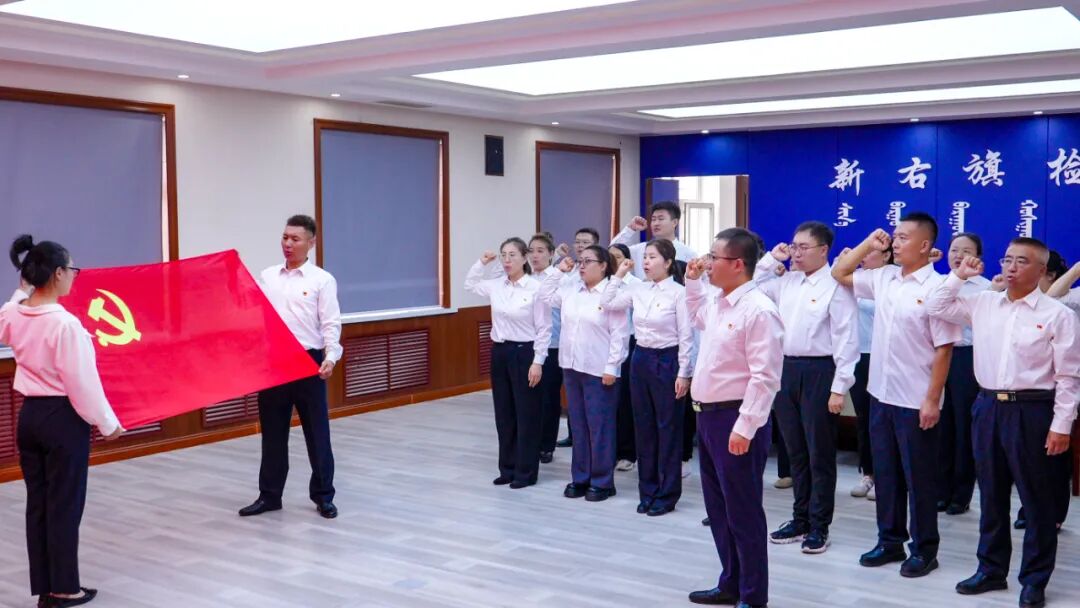 在鲜红的党旗面前,全体党员庄严列队,由院党组书记、检察长涂江鸿领誓,重温入党誓词。铿锵有力的入党誓词回荡在检察大厅,党员们以坚定的眼神、饱满的斗志,表达出对党的忠诚和为检察事业奋斗终身的决心。一句句铿锵有力的誓言,让党员们再次回顾入党时的庄严承诺,强化了党性意识,激励着检察人员在今后的工作和生活中,时刻以党员标准严格要求自己,永葆共产党员的政治本色。